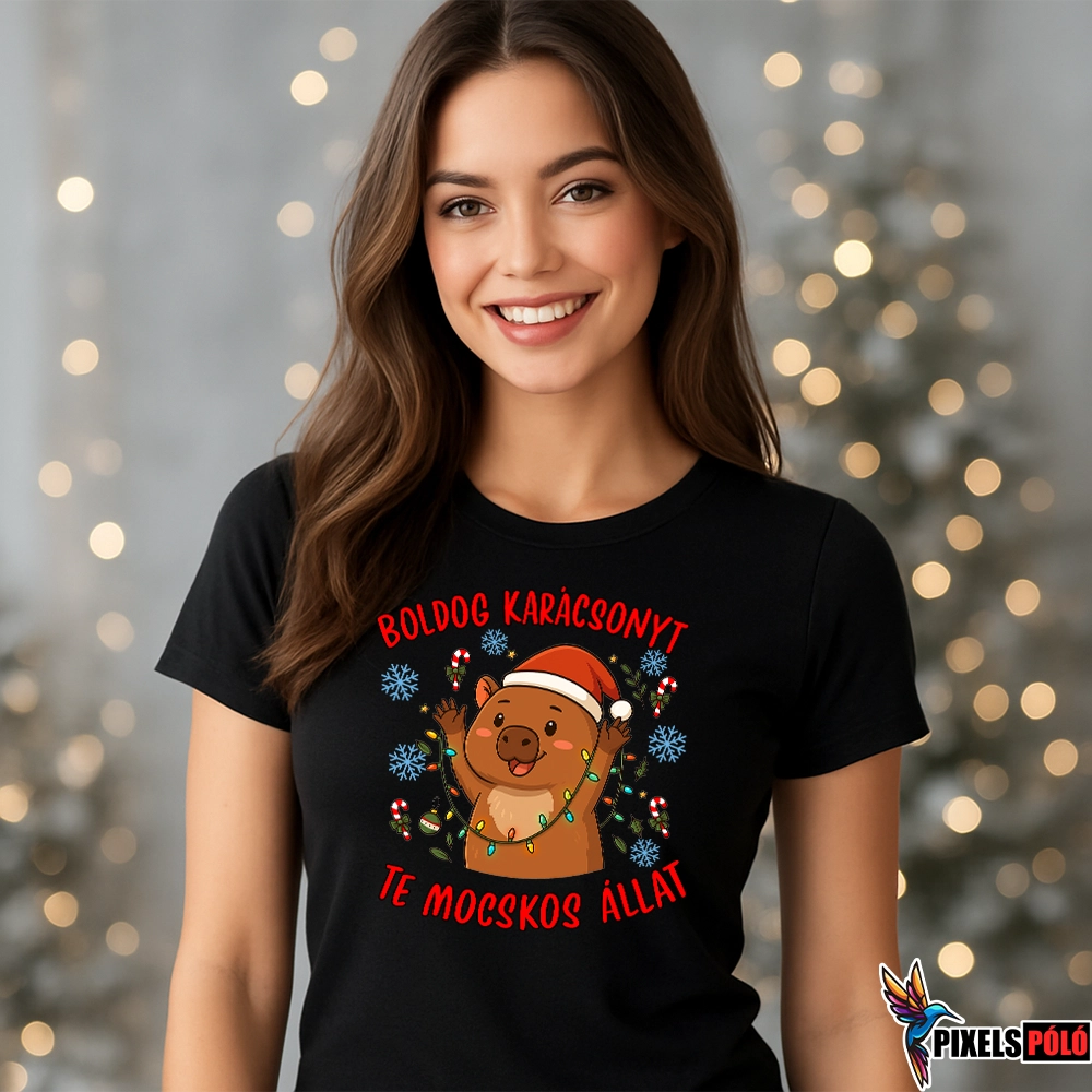 A „Boldog karácsonyt, te mocskos állat!” felirat a Reszkessetek, betörők ikonikus idézetére utal, amit most egy aranyos Capybara hoz életre a karácsonyi égősorral a kezében.