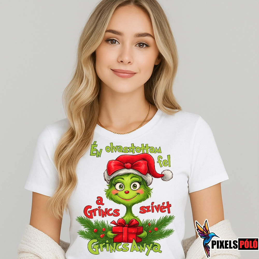 A póló grafikáján egy cuki Grincs lány látható mikulás sapkában, „Én olvasztottam fel a Grincs szívét” és „GRINCS ANYA” felirattal.