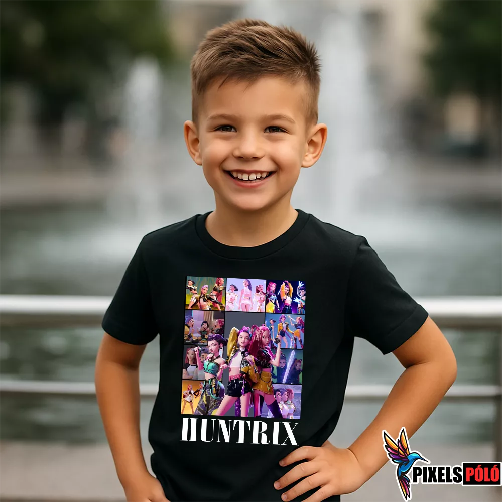 A Huntrix Collage Póló egy különleges, színes és dinamikus grafikájú gyerek póló, amely a mai anime- és fantasy stílusú karaktervilágok hangulatát idézi. A pólón egy igényesen összeállított kollázs látható, energikus pózokkal és élénk színekkel, amely rögtön magára vonja a figyelmet.
