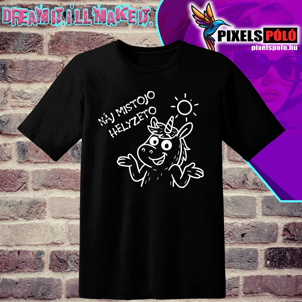 A fekete alapon fehér grafikával készült pólón egy rajzolt egyszarvú tárja szét a karját, mellette a szöveg: „Náj Mistojó Helyzeto” – ami már önmagában is egy életérzés. Tökéletes választás barátoknak, testvéreknek, vagy akár saját magadnak, ha egy kis kreatív őrületre vágysz.