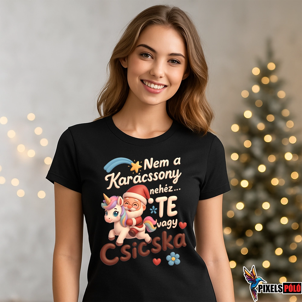 A pólón egy Pixar stílusban megrajzolt Télapó látható, aki egy unikornison lovagol – a grafika alatt pedig a poénos felirat: