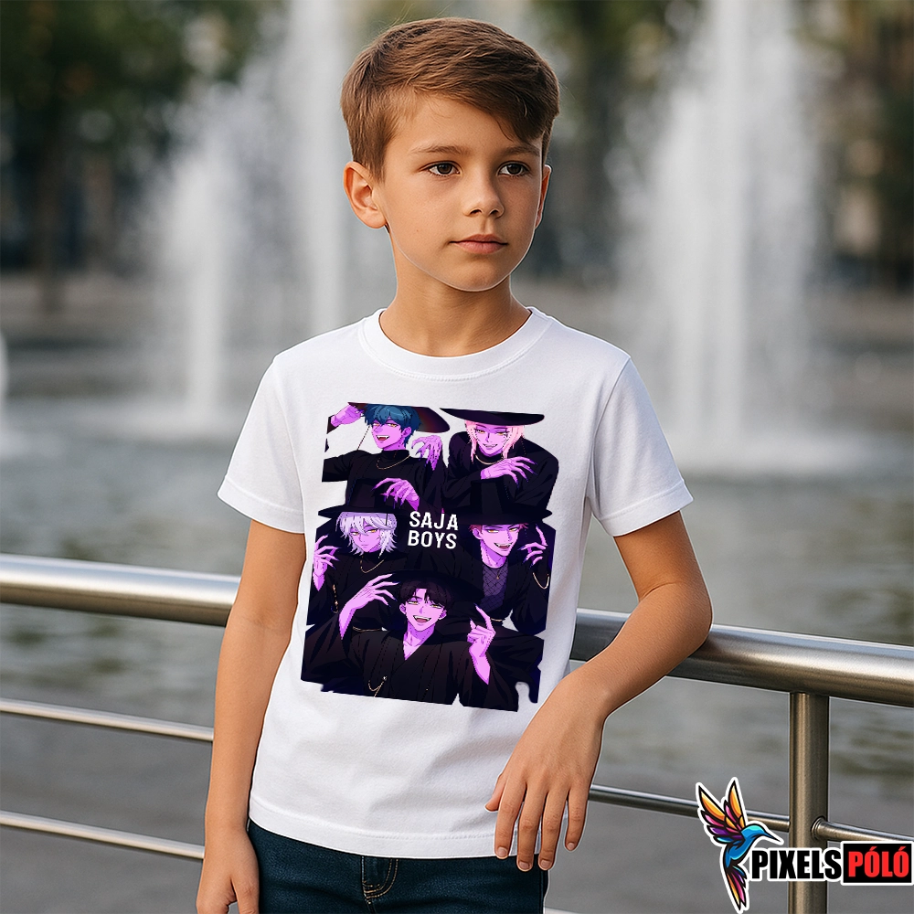 Saja Boys Dark Style Póló – kisfiú fehér pólóján csapat grafika sötét stílusban